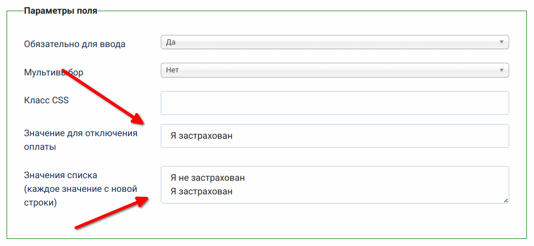 По заполнению аналогично полю «Список». То есть, варианты значений радио кнопок заполняются в текстовом поле «Значения списка».
