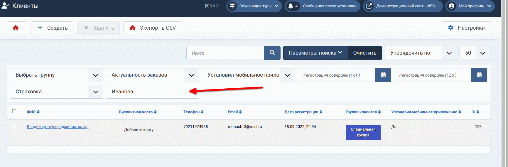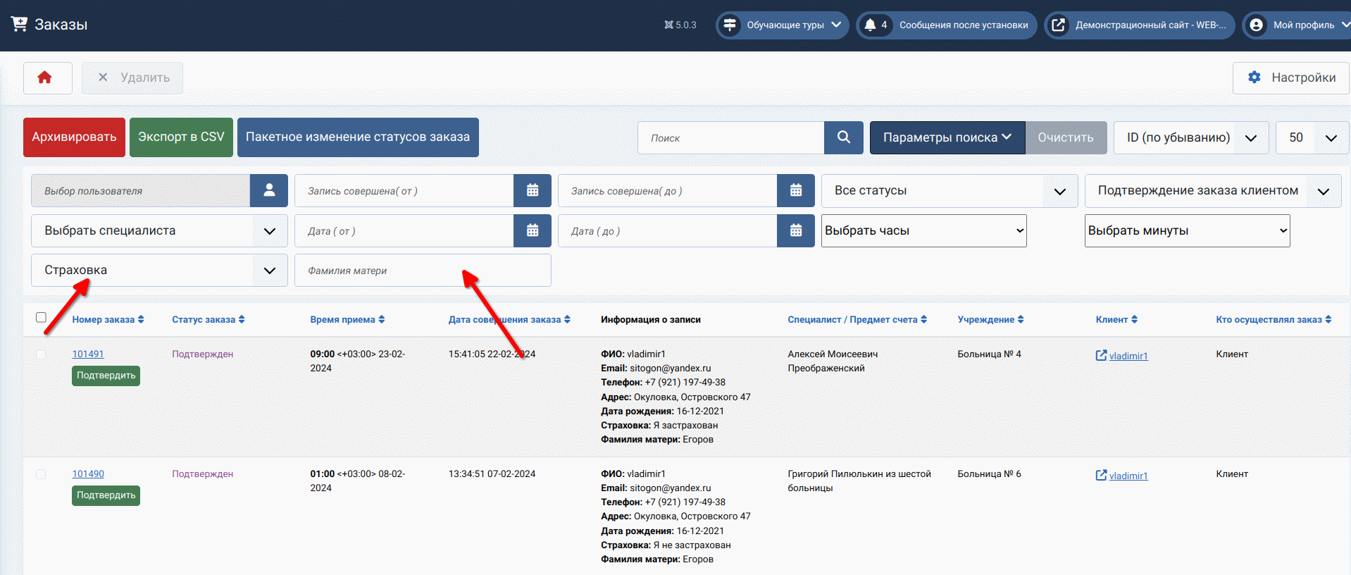 Раздел «Заказы» позволяет осуществлять поиск не только по дате, номеру заказа, имени специалиста, но также по фио, email, телефону клиента.