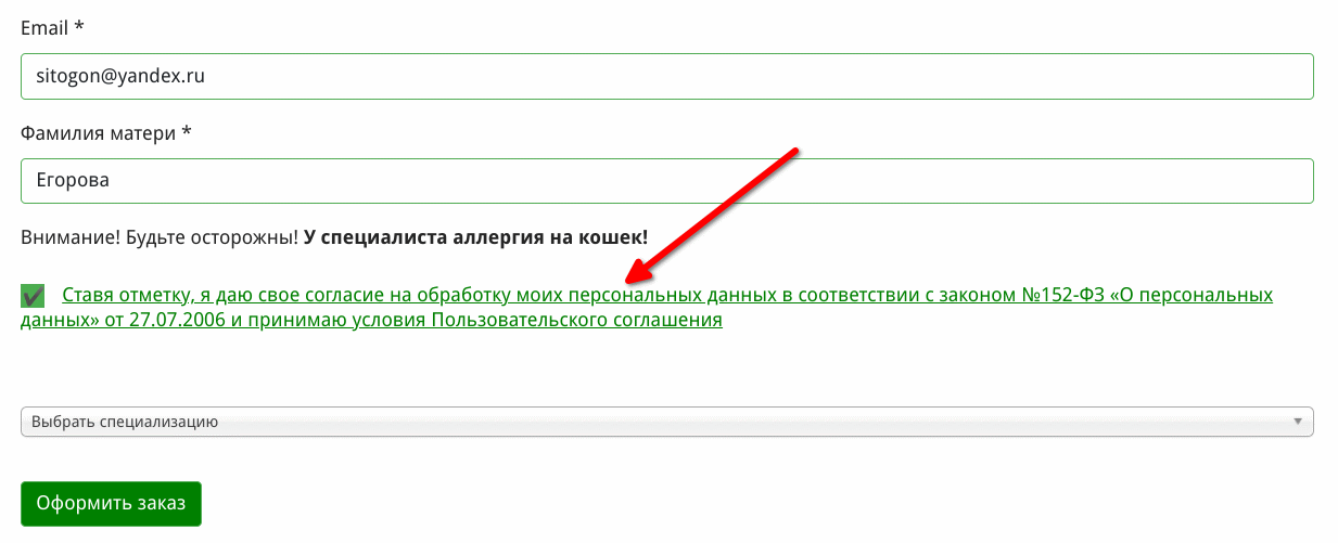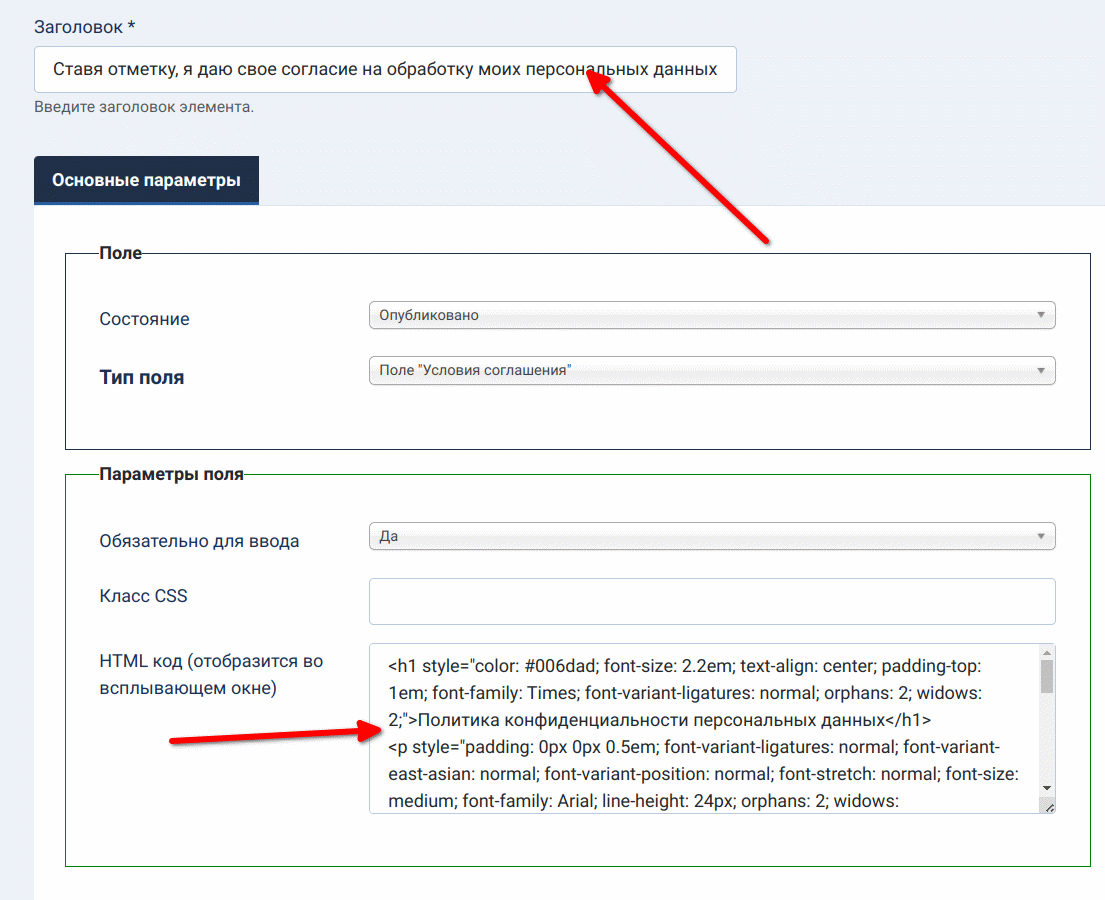 Данный тип поля позволяет отобразить согласие с условиями работы вашего сайта или сервиса.