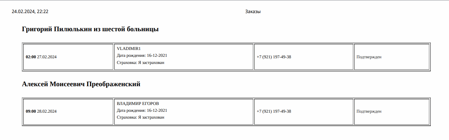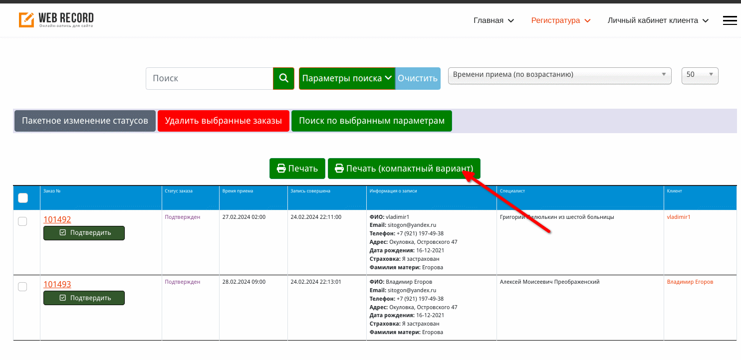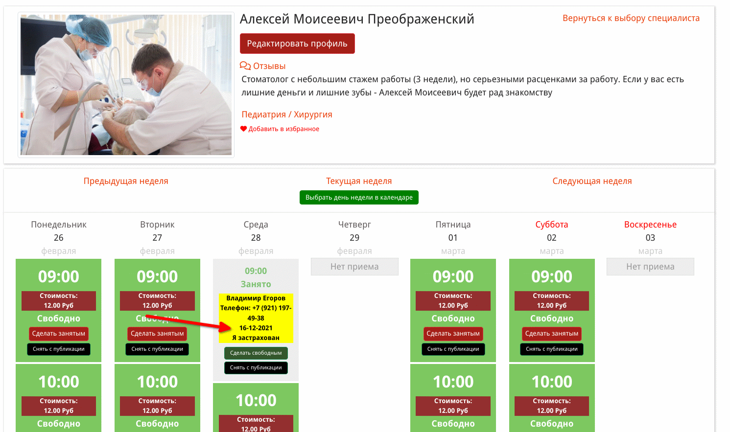Если мы авторизуемся на сайте, как сотрудник регистратуры и зайдем на страницу специалиста, нам станут доступны данные посетителей, которые осуществили запись на прием.