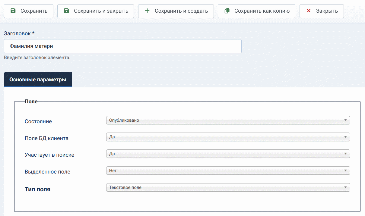 Страница редактирования включает в себя поле с заголовком и три группы параметров обозначенные, как «Поле», «Параметры поля» и «Отображение».