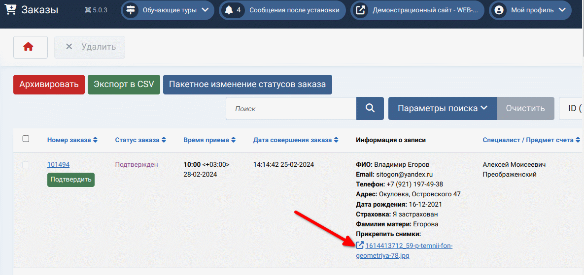 Сам файл становится виден администратору сайта или сотруднику регистратуры при просмотре заказа.