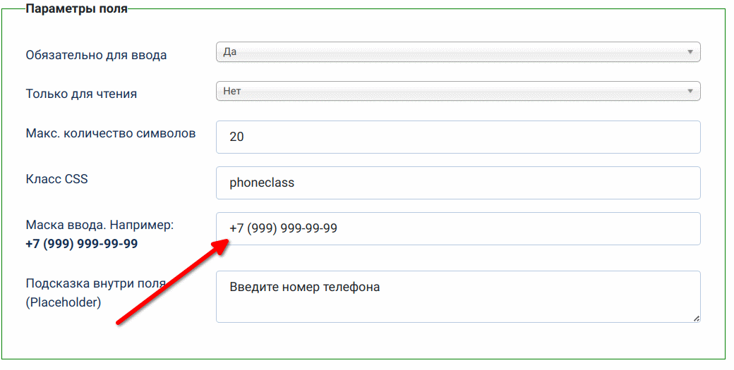 Единственным отличием от типа поля «Текстовое поле» является возможность установки маски номера телефона.