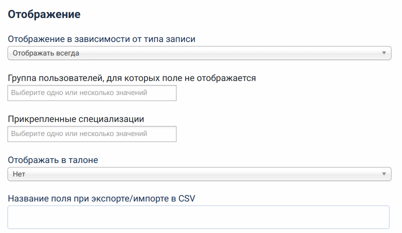 Если в данном поле выбрана одна или несколько специализаций, то поле будет отображаться только у тех специалистов, которые относятся к выбранным специализациям.