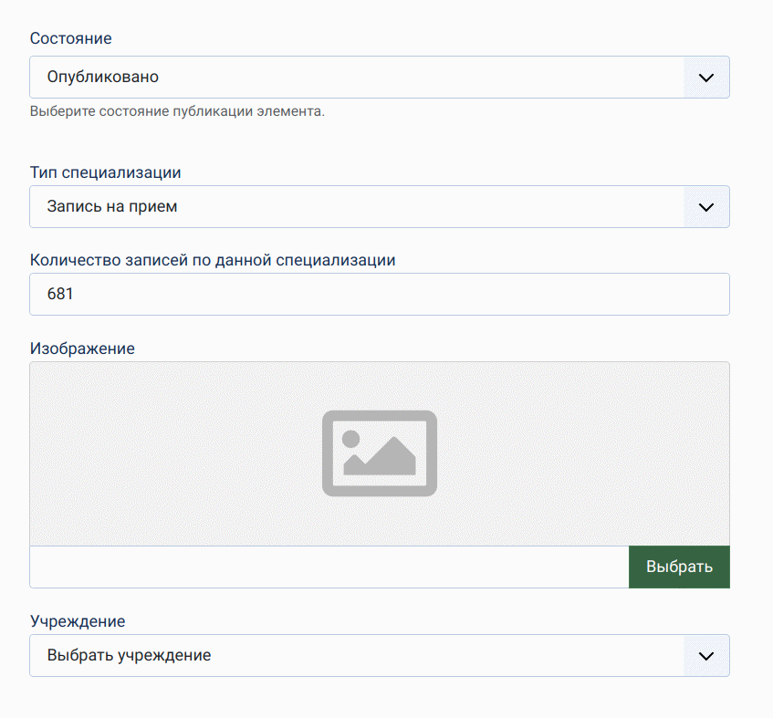 Далее расположен выпадающий список «Учреждение», который позволяет привязать специализацию к определенному учреждению.