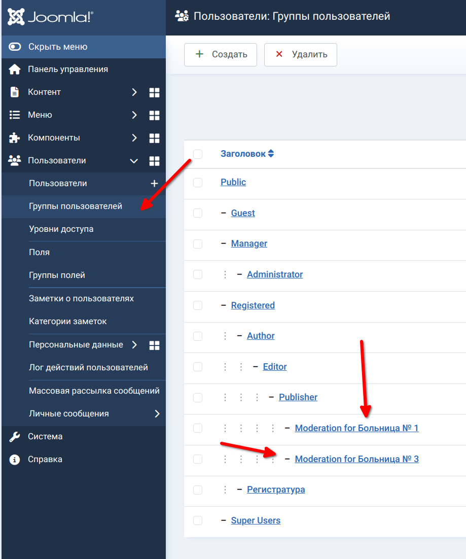 В дальнейшем, после создания учреждения, можно увидеть созданную группу в разделе «Группы Пользователей» административной панели Joomla.