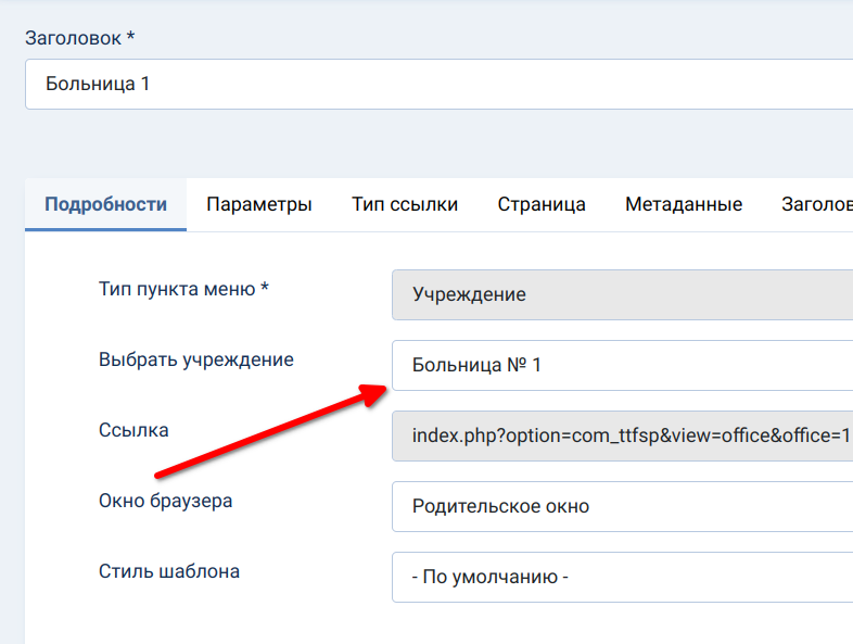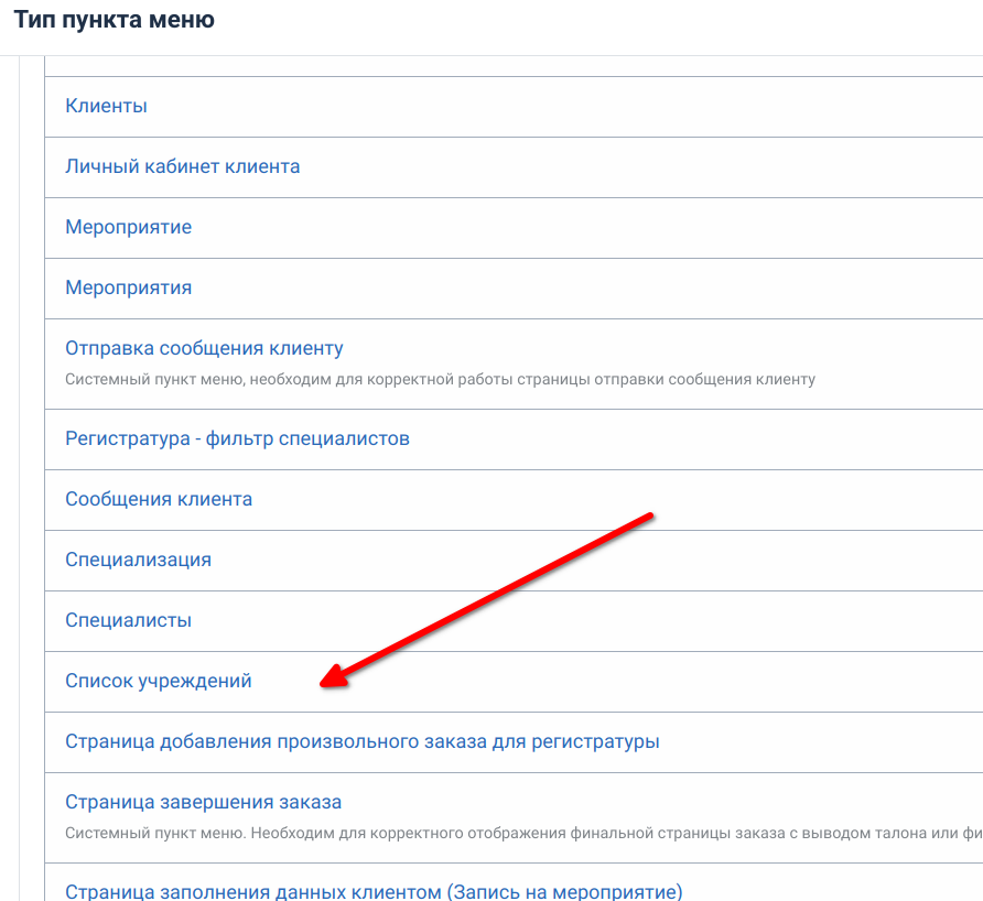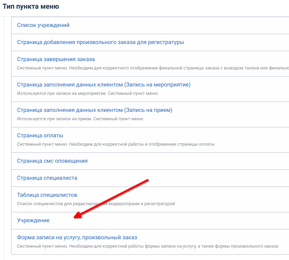 Для создания пункта меню ведущего на страницу определенного учреждения, необходимо выбрать тип пункта меню «Учреждение».