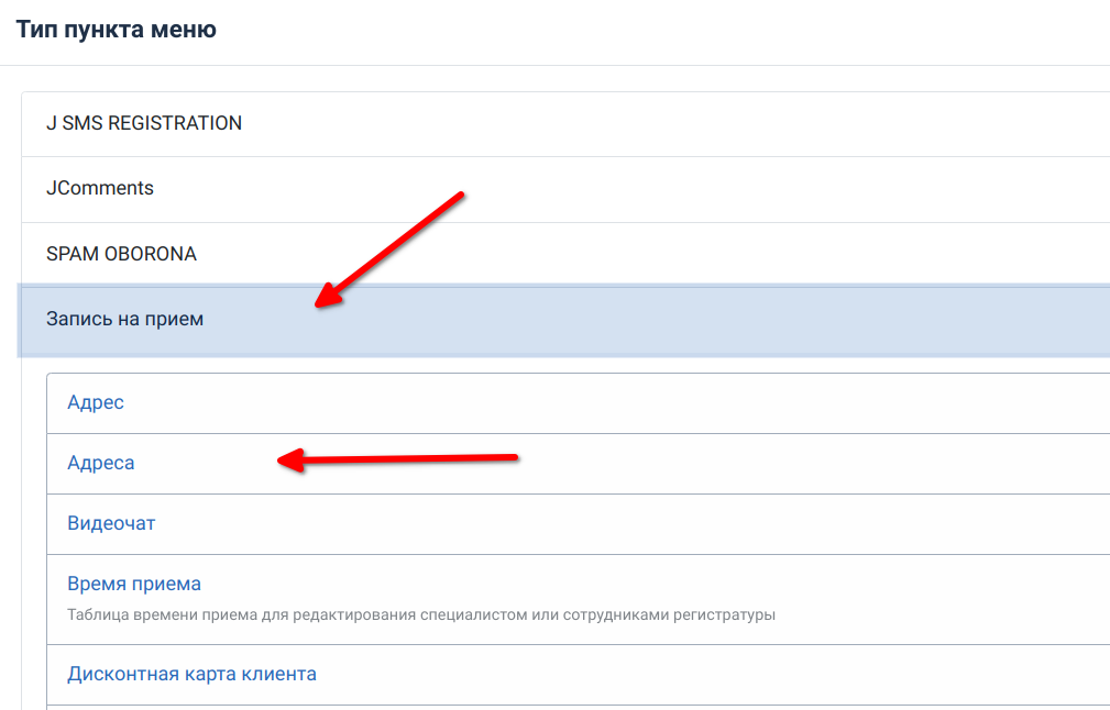 Для того, чтобы посетитель сайта смог открыть страницу, где отображается список наших городов, необходимо создать пункт меню, тип которого будет «Адреса»