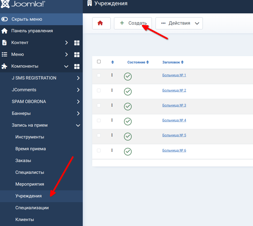 Для создания учреждения переходим в одноименный раздел в административной части компонента «Запись на прием».