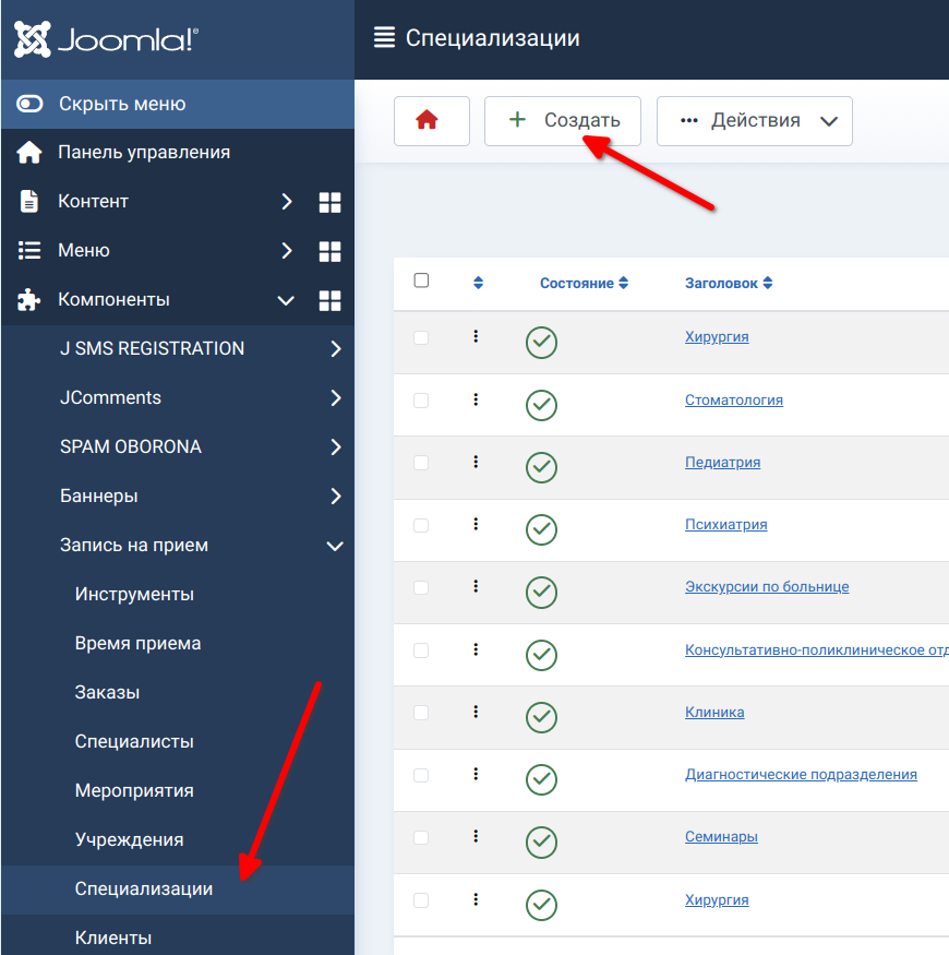 В следующих статьях мы научимся создавать специалистов, время приема, поля заполняемые посетителем сайта при записи на прием и многое другое.