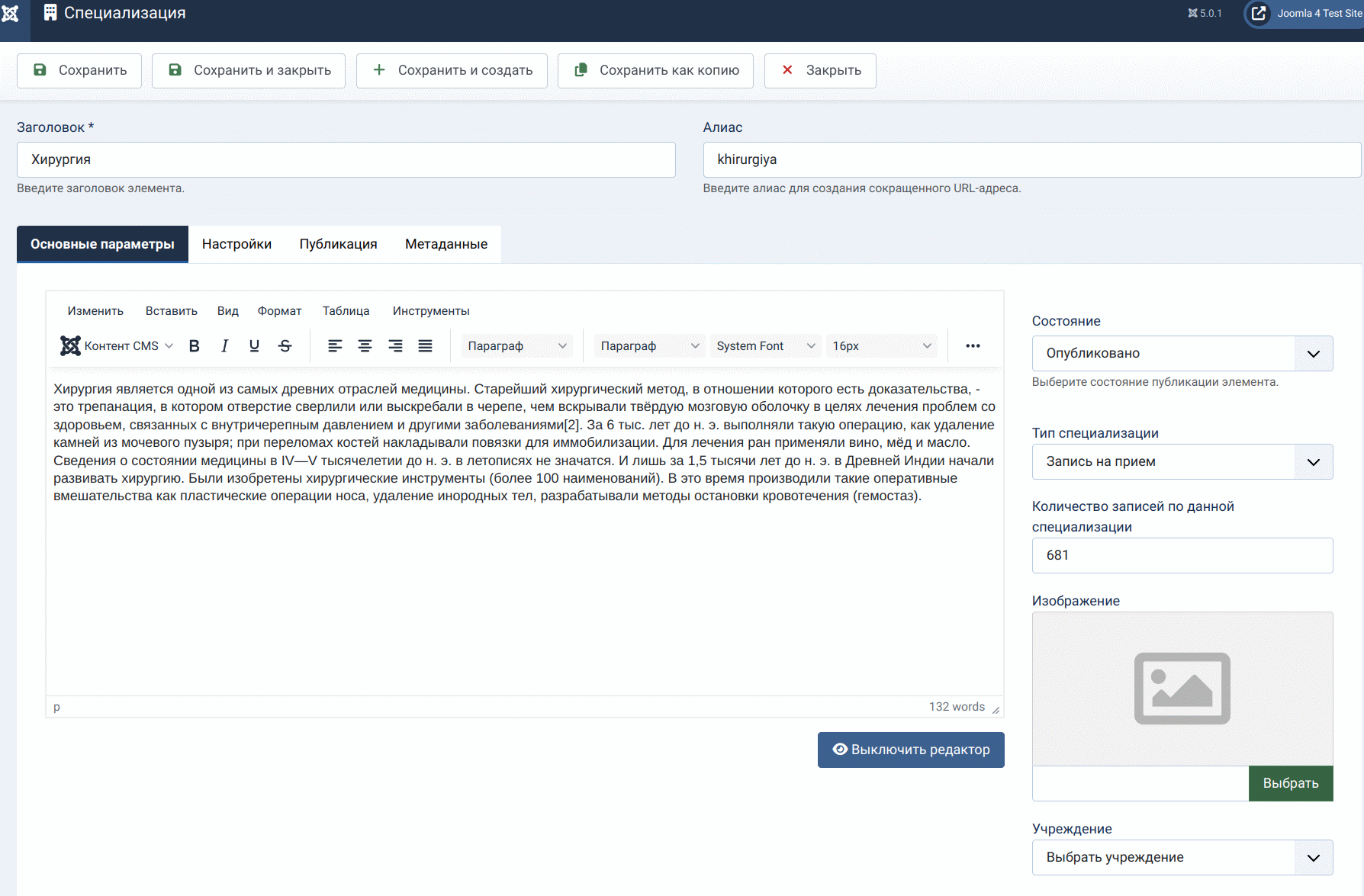 В левой части страницы мы видим поле с визуальным редактором, где заполняем описание специализации.