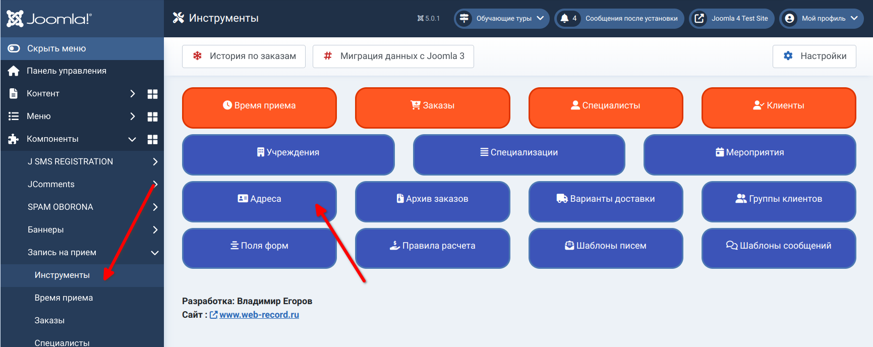 Начнем мы выполнение нашей задачи с создания городов. А делать мы будем это в разделе «Адреса» административной панели компонента «Запись на прием».